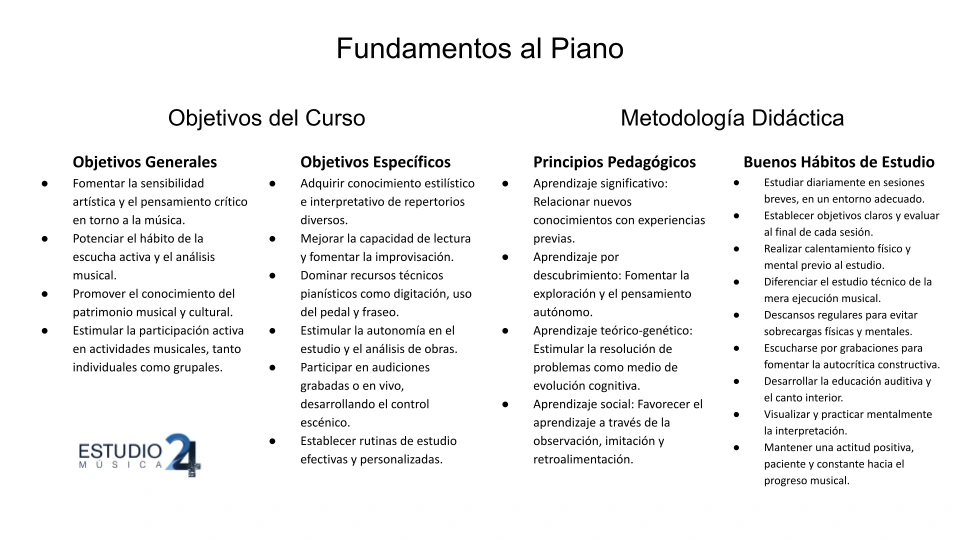El curso de piano se sustenta en una combinación de objetivos bien definidos y una metodología innovadora, integradora y personalizada. Al complementar la formación instrumental con prácticas de estudio conscientes, el programa ofrece al alumnado una experiencia musical completa, rigurosa y enriquecedora, centrada tanto en la excelencia técnica como en el desarrollo humano y artístico.